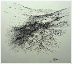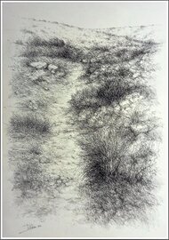 "Bushes between hills" Pitt charcoal on cream grey cardboard 60 × 53 cms.
