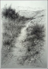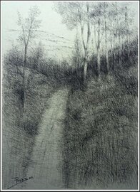 "Path II" Pitt charcoal on cream grey cardboard 70 × 50 cms.